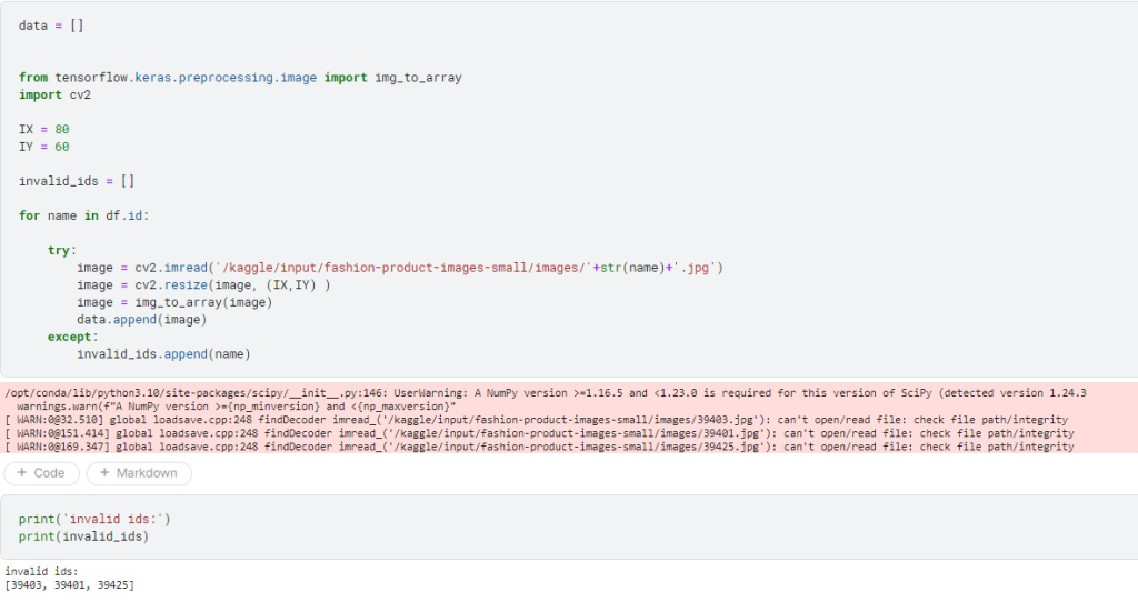 First, we added the photos in our dataset to our list called “data” by going through some processes. We kept the indexes of the columns where no photos could be found in a list and printed them.