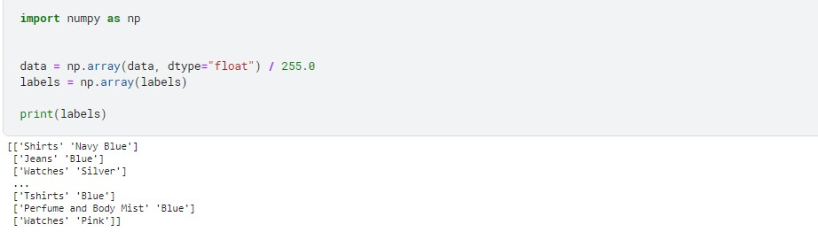 We converted our data and labels lists into numpy arrays. We applied normalization while transforming the data list.