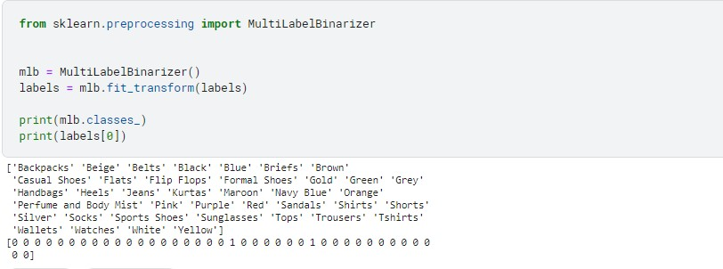 We converted our labels list to binary using a MultiLabelBinarizer. We also got all the class values we had with the mlb.classes_ code.