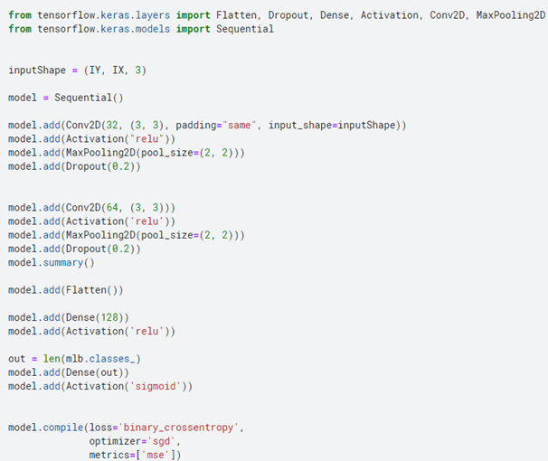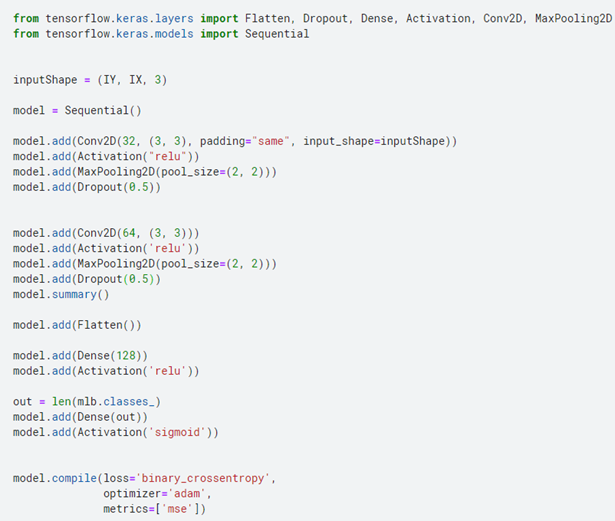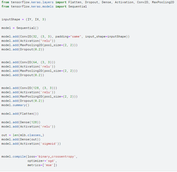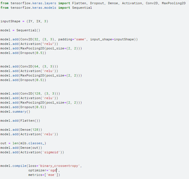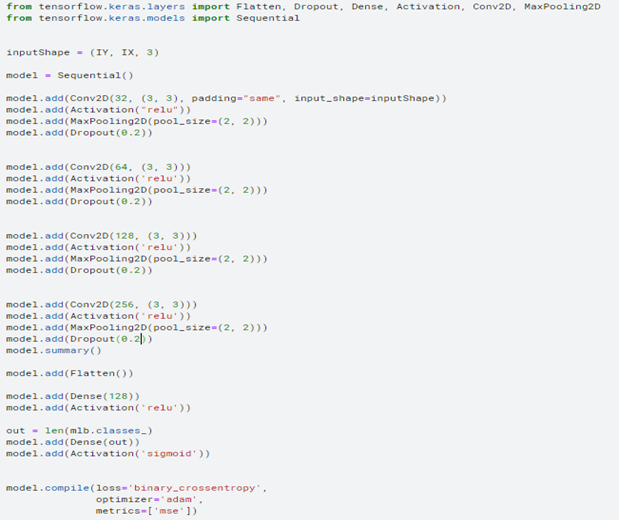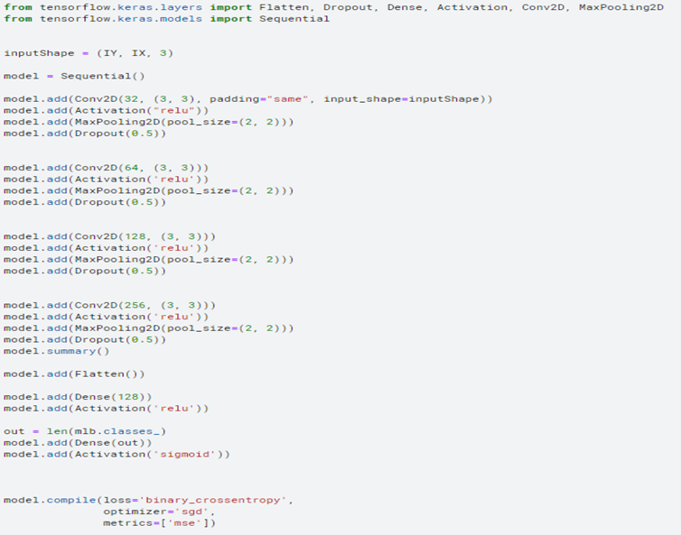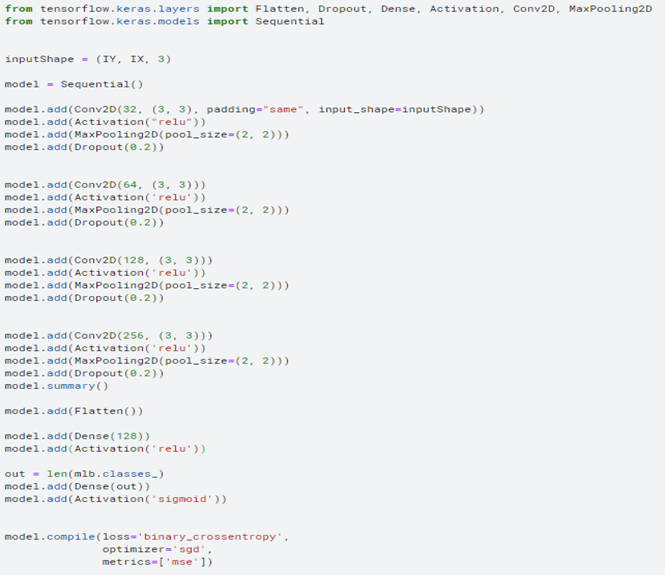 The CNN model we designed has a dropout value of 0.2 within the convolution layers. As an optimizer, it had the ‘adam’ optimizer.